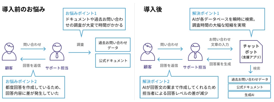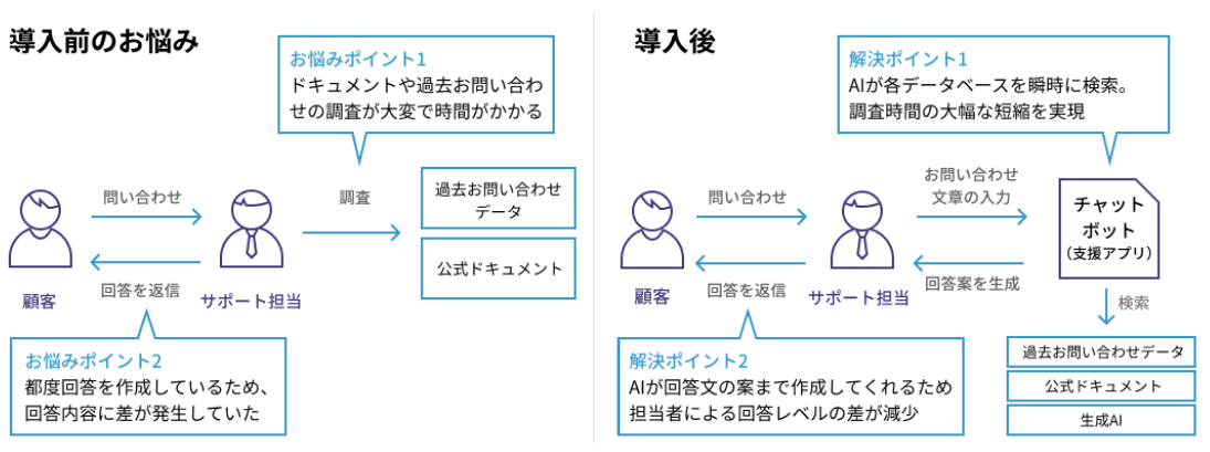 お客様からのお問い合わせへの回答速度や品質をあげるため、ボトルネックとなっていた各種情報データベースの調査や回答文の作成を、生成 AI を活用したチャットボットに任せることにより、業務効率や品質の向上に繋げることに成功しています。