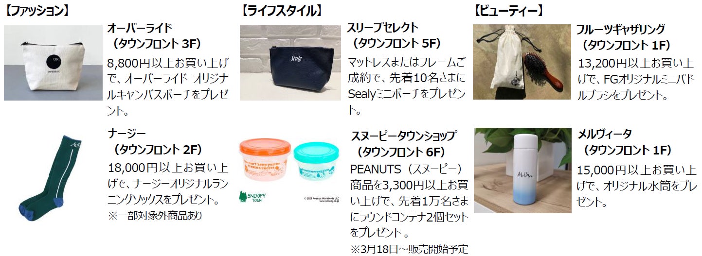 限定アイテム以外にも、多くの店舗で12th Anniversaryの感謝を込めたさまざまな特典をご用意します。ファッション性の高いオリジナルのポーチや人気キャラクターのラウンドコンテナ(お弁当箱)など、うれしい特典が満載で、春のショッピング体験を後押しします。