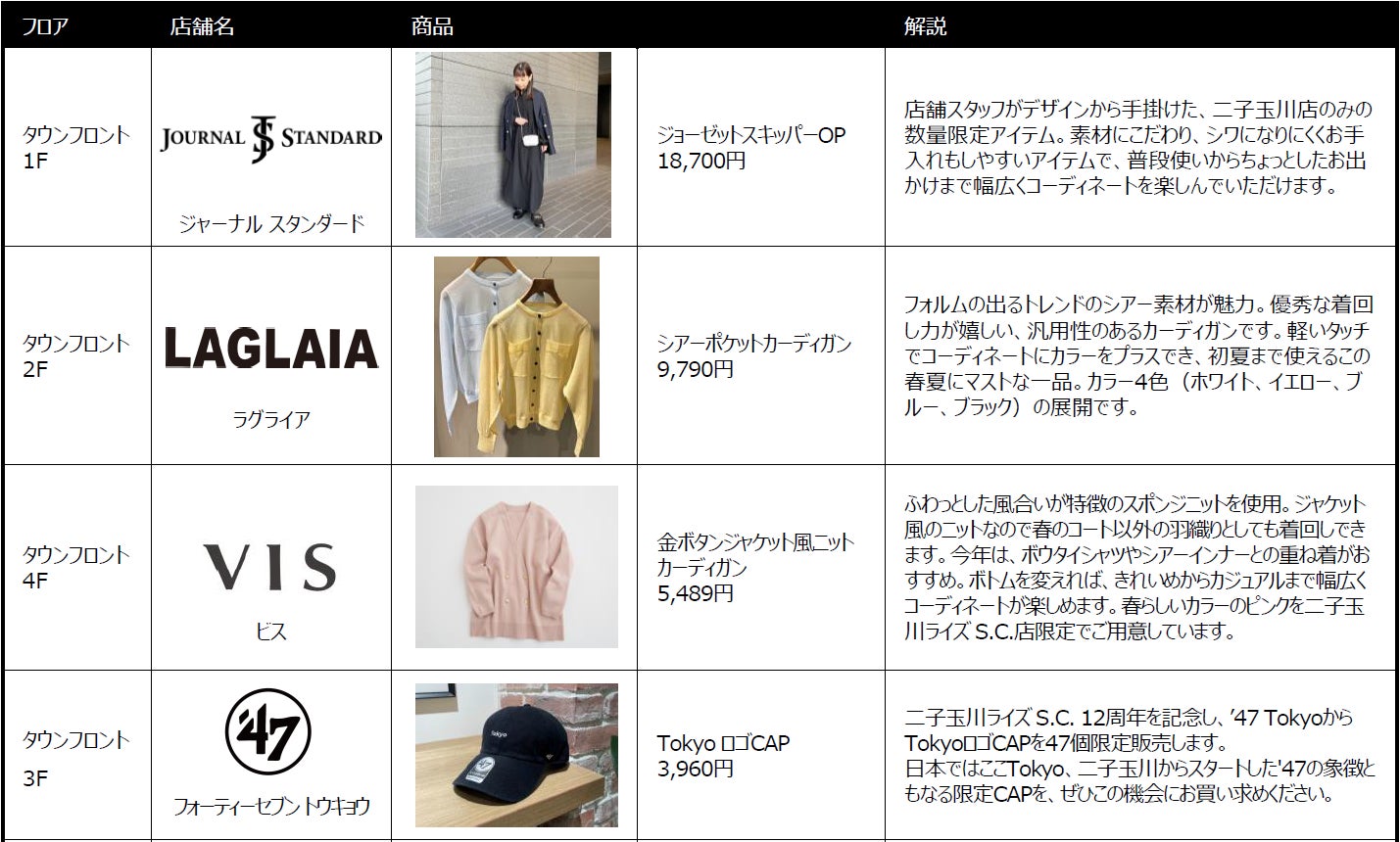 「ジャーナル スタンダード」「ラグライア」「ビス」など、二子玉川ライズ S.C.の人気ファッションブランドから春らしいカラーの限定アイテムが登場するほか、「フォーティーセブン トウキョウ」ではオリジナルの限定キャップを販売。さらに「サーモス スタイリングストア」「エトヴォス」などライフスタイルやビューティーショップからも12th Anniversaryを記念した二子玉川ライズ S.C.限定アイテムを展開します。ここでしか手に入らない特別な商品は、どれも春をより楽しく彩ること間違いなしの限定アイテムです。