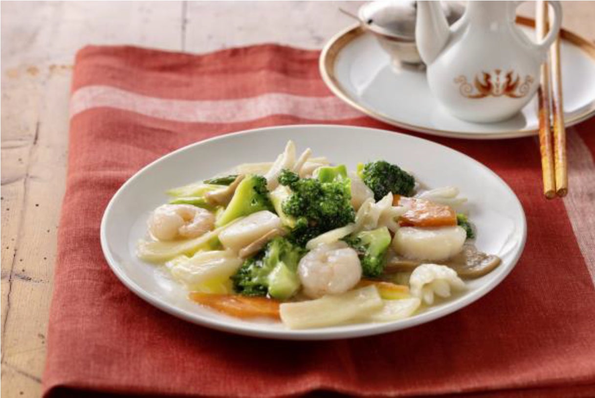 アスパラ、筍、ブロッコリーなどの春野菜と海老、イカ、ホタテを 合わせて塩炒めにしました。彩りも鮮やかで、見た目からも食欲がわきます。野菜の甘味が引き立つ上品な味わいの一品です。具材の食感をお楽しみください。