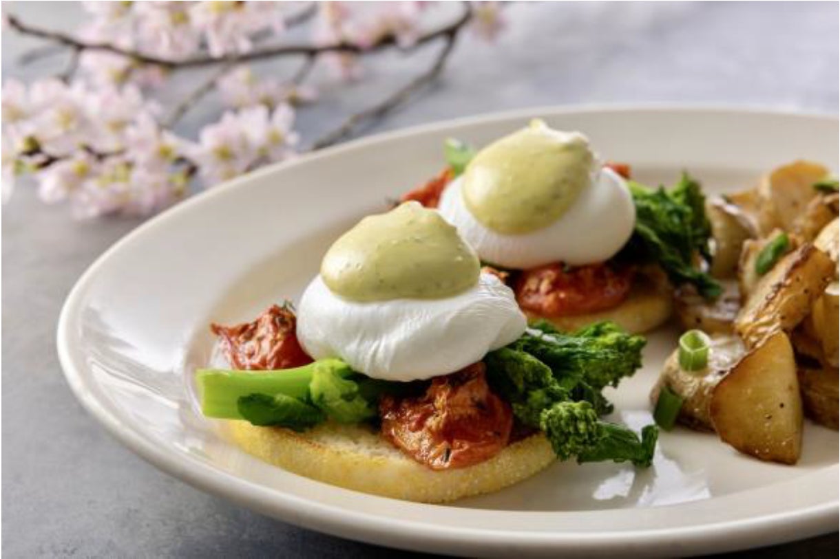 春野菜の菜の花とセミドライトマトを加え、最後にバジル薫るオランデーズソースで仕上げた一品。