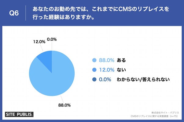Q5で「全面リニューアル」と回答した方に、「Q6.あなたのお勤め先では、これまでにCMSのリプレイスを行った経験はありますか。」(n=75)と質問したところ、「ある」が88.0%、「ない」が12.0%という回答となりました。