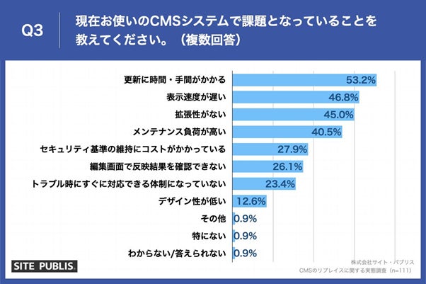 「Q3.現在お使いのCMSシステムで課題となっていることを教えてください。(複数回答)」(n=111)と質問したところ、「更新に時間・手間がかかる」が53.2%、「表示速度が遅い」が46.8%、「拡張性がない」が45.0%という回答となりました。