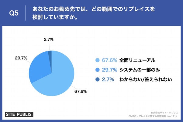 「Q5.あなたのお勤め先では、どの範囲でのリプレイスを検討していますか。」(n=111)と質問したところ、「全面リニューアル」が67.7%、「システムの一部のみ」が29.7%という回答となりました。