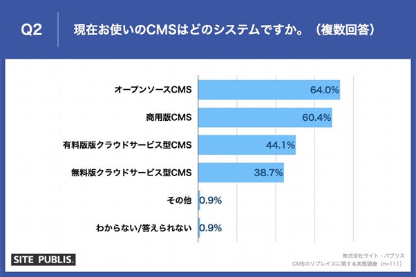 「Q2.現在お使いのCMSはどのシステムですか。(複数回答)」(n=111)と質問したところ、「オープンソースCMS」が64.0%、「商用版CMS」が60.4%、「有料版版クラウドサービス型CMS」が44.1%という回答となりました。