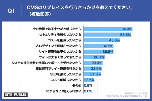 「Q1.CMSのリプレイスを行うきっかけを教えてください。(複数回答)」(n=111)と質問したところ、「今の機能では不十分だと感じたから」が60.4%、「セキュリティを強化したいから」が58.6%、「コストを削減したいから」が45.0%という回答となりました。
