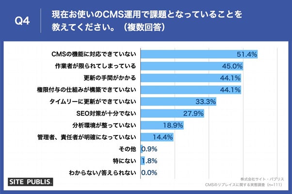 「Q4.現在お使いのCMS運用で課題となっていることを教えてください。(複数回答)」(n=111)と質問したところ、「CMSの機能に対応できていない」が51.4%、「作業者が限られてしまっている」が45.0%、「更新の手間がかかる」が44.1%という回答となりました。
