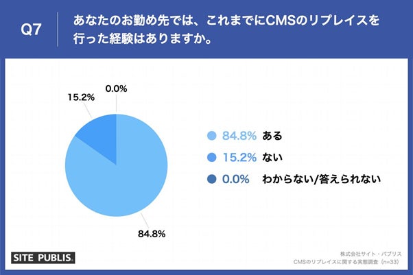 Q5で「システムの一部のみ」と回答した方に、「Q7.あなたのお勤め先では、これまでにCMSのリプレイスを行った経験はありますか。」(n=33)と質問したところ、「ある」が84.8%、「ない」が15.2%という回答となりました。