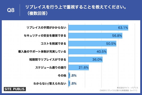 「Q8.リプレイスを行う上で重視することを教えてください。(複数回答)」(n=111)と質問したところ、「リプレイスの手間がかからない」が63.1%、「セキュリティの安全を確保できる」が56.8%、「コストを削減できる」が50.5%という回答となりました。