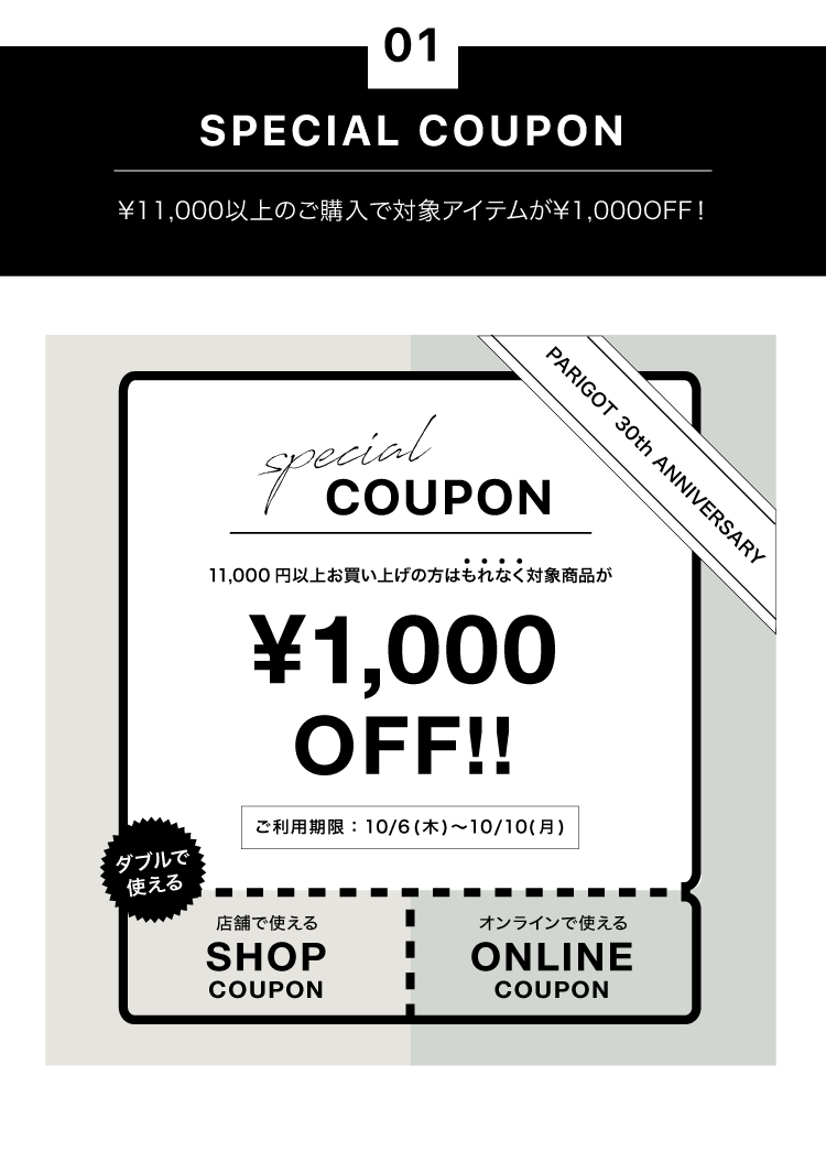 お得なクーポンをプレゼントいたします!パリゴ店舗、パリゴオンラインで使えるクーポンをそれぞれご用意いたしました。是非この機会にお買い物をお楽しみくださいませ。