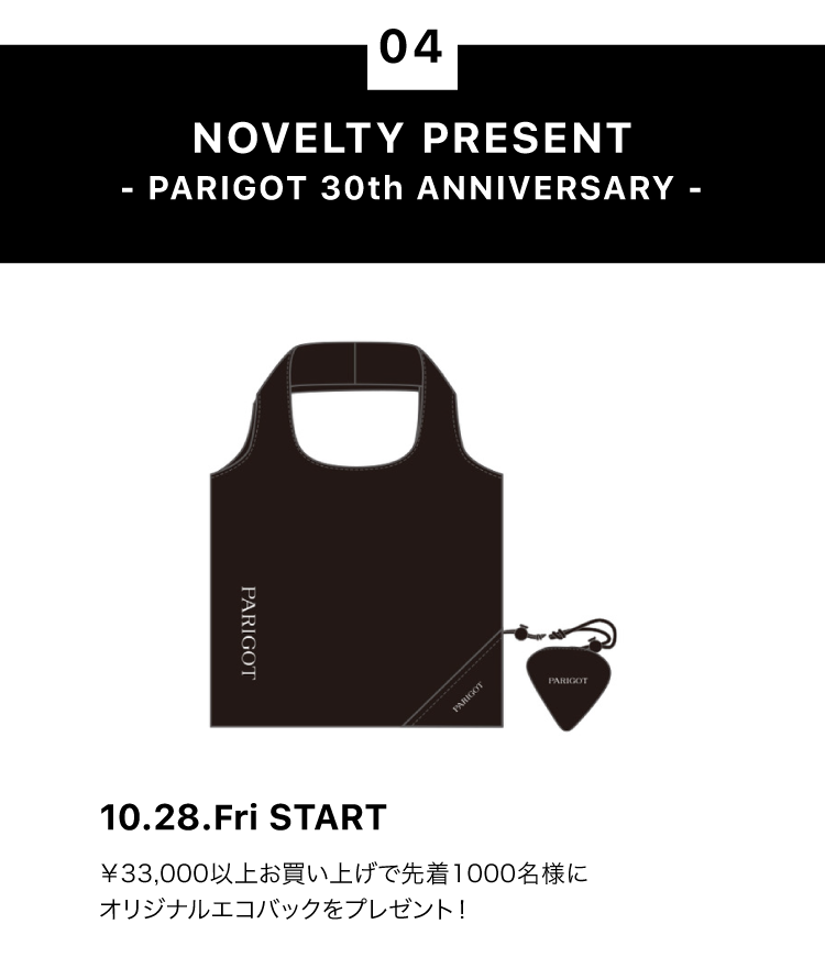 PARIGOT 30周年を記念して、オリジナルエコバッグを作成しました!ハイクオリティな素材を使用して作成したバッグはパッカブルタイプでクルっと丸めて持ち運べる優れもの。10/28(金)より配布予定。是非ご期待ください!