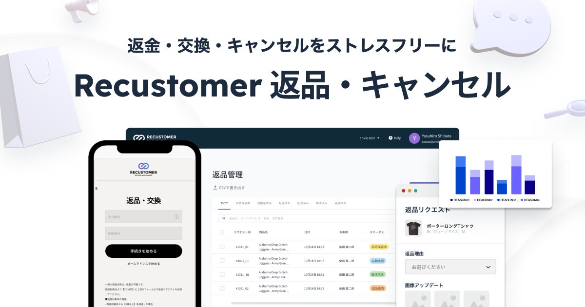 「Recustomer 返品キャンセル」は、EC事業者の返品・交換・注文キャンセル業務を自動化するサービスです。返品・注文キャンセル依頼受付から、集荷手配・在庫確保・キャンセル時の発送停止業務など様々な業務を自動化することで、時間とコスト削減と顧客体験の向上を実現します。