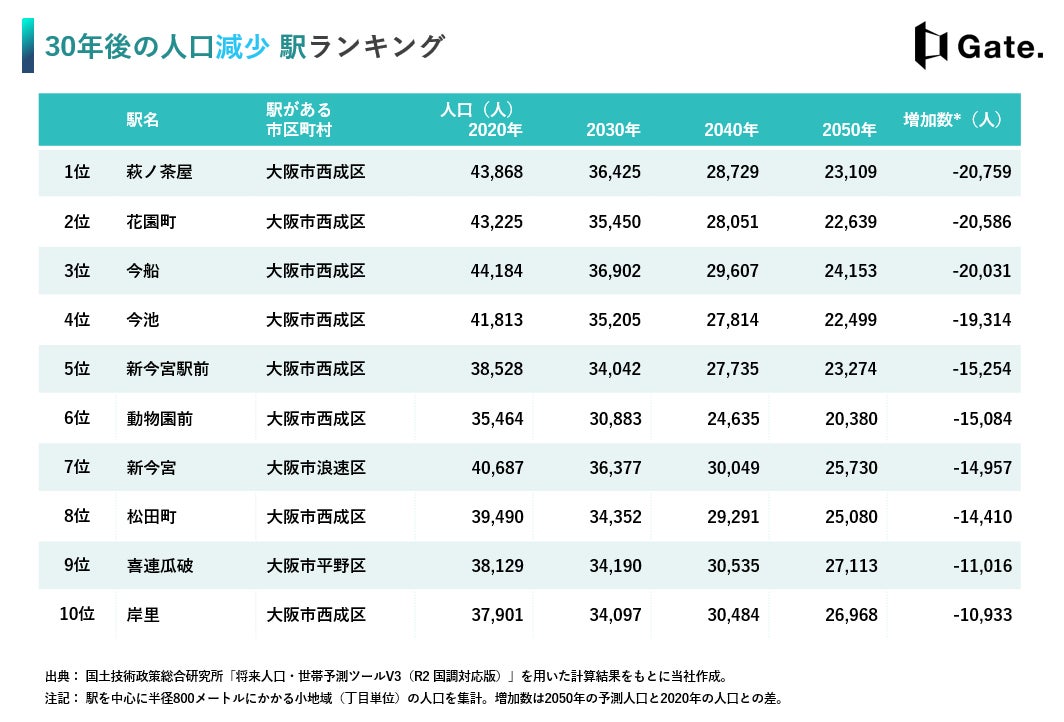 国土技術政策総合研究所が提供する「将来人口・世帯予測ツールV3(R2 国調対応版)」は、国勢調査の小地域人口・世帯データを用いてコーホート法により将来人口予測を行い、グラフ表示やマップ表示する機能を備えた Excel ベースのツールです。今回のランキングは、当社のエンジニアチームが「将来人口・世帯予測ツールV3(R2 国調対応版)」を使用し、駅ごとの詳細な人口変動を表したものです。