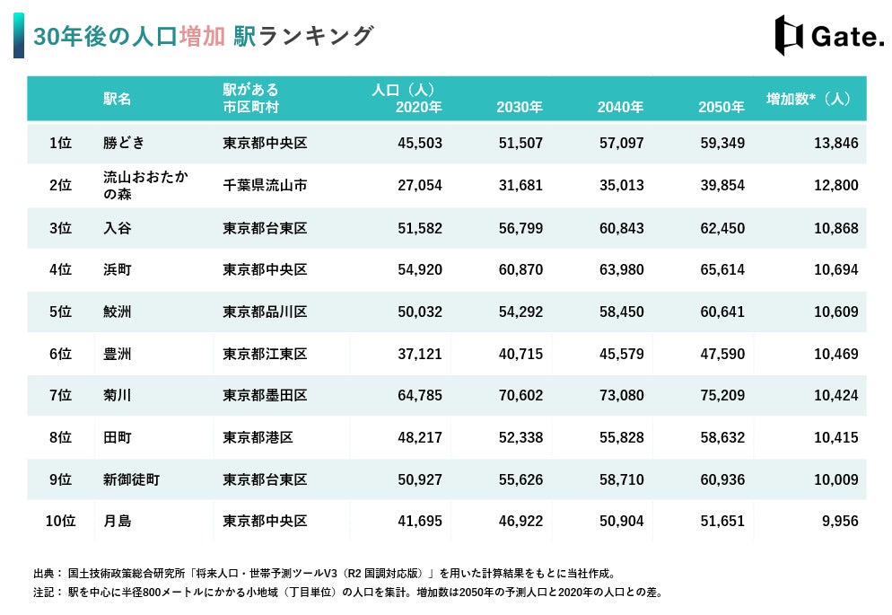 リーウェイズ株式会社(本社:東京都渋谷区、代表取締役:巻口成憲、以下:リーウェイズ)は、国土技術政策総合研究所「将来人口・世帯予測ツールV3(R2 国調対応版)」を用いて、「30年間で人口が増加・減少する駅ランキング」を発表しました。本ランキングは、今後の都市計画や社会問題解決に向けた重要な指標となります。なお、今回は人口増減を率ではなく人数で表しています。