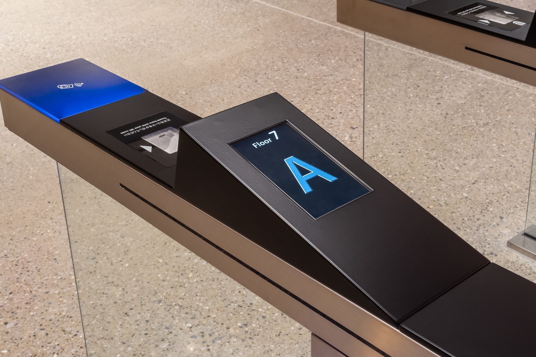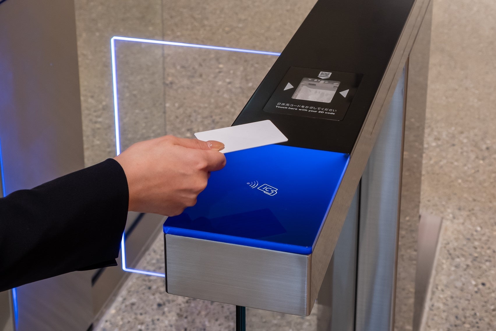 「森永芝浦ビル」では、オフィス利用者がセキュリティーゲートでかざすカードキーに、あらかじめ勤務する階を目的階情報として登録。セキュリティーゲートを通過すると、瞬時に最適なエレベータ号機を割り当てます。利用者はセキュリティーゲートの液晶モニターに表示されたエレベータ号機に乗り込みます。
