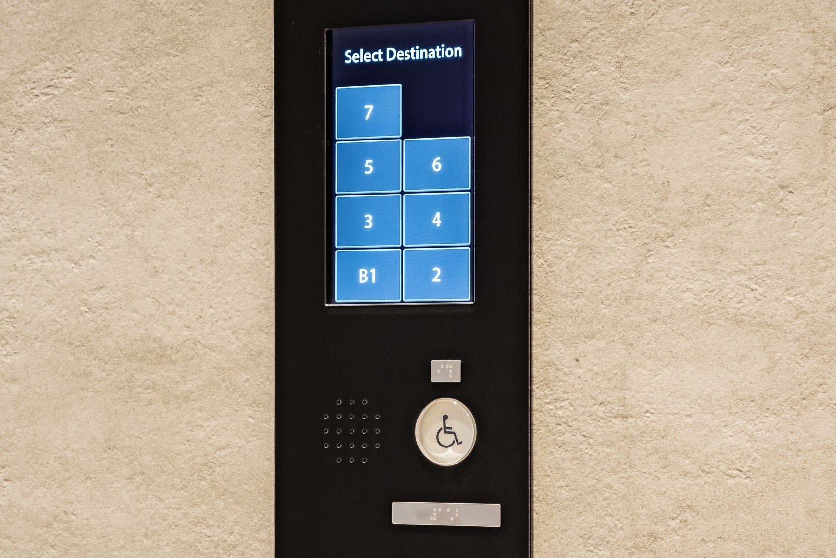 「EZ-SHUTTLE(イージーシャトル)」は、エレベータに乗る前に利用者の目的階を登録し、運行中のエレベータに利用者を最適配分することで、エレベータの台数や定員を増やさずに、運行を効率化する仕組みです。移動時間を短縮※することができるため、朝の通勤時間帯などに、エレベータ待ちの渋滞が発生しやすい大型オフィスビル向けのシステムです。海外では一般的なシステムですが、国内での納入事例はまだ珍しく、当社では国内4例目となります。
