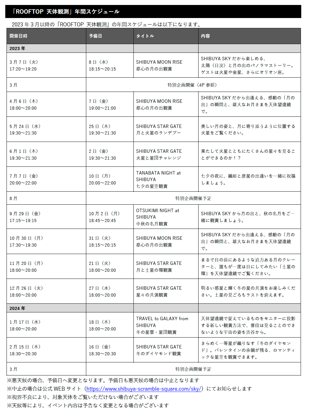 ・「ROOFTOP 天体観測」の年間スケジュールを公開