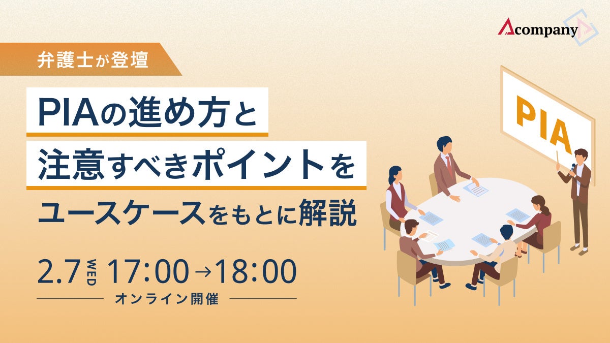 株式会社Acompany(アカンパニー、愛知県名古屋市西区、代表取締役CEO 高橋亮祐、以下Acompany)は、プライバシー影響評価(Privacy Impact Assessment:以下、PIA)の進め方や注意すべきポイントなどを解説するウェビナー「【弁護士が登壇】PIAの進め方と注意すべきポイントをユースケースをもとに解説」を、2月7日(水)17:00-18:00に開催します。