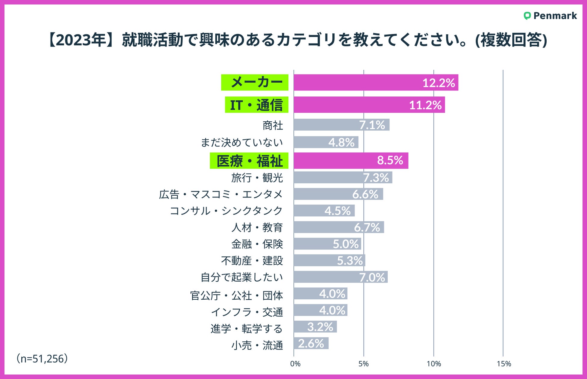 上位2つに関しては、2023年も同様に1位「メーカー(12.2%)」、2位「IT・通信(11.2%)」となっており、この2つの業界に対するZ世代の高い関心が見られた。