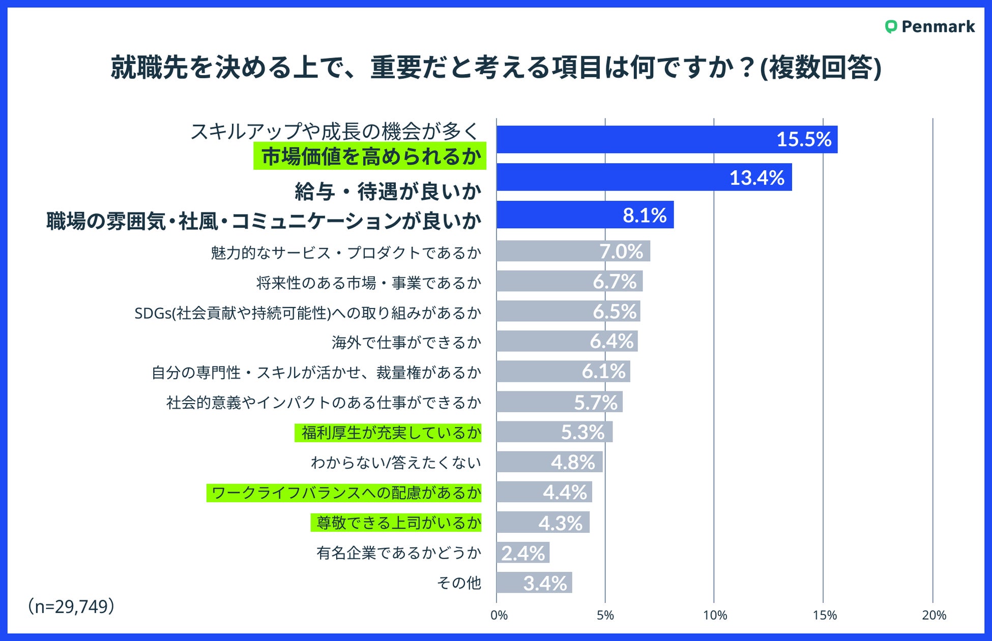 男女で比較すると、「スキルアップや成長の機会が多く市場価値を高められるか」に関しては男女ともに最も重視する項目であるが、2位以降で違いが見られた。男性は、スキルアップや成長の機会の次に、「給与・待遇が良いか(15.5%)」や「職場の雰囲気・社風・コミュニケーションが良いか(8.6%)」を重視している。一方で、女性は、「魅力的なサービス・プロダクトであるか(12.0%)」や「SDGsへの取り組みがあるか(10.7%)」が続く。