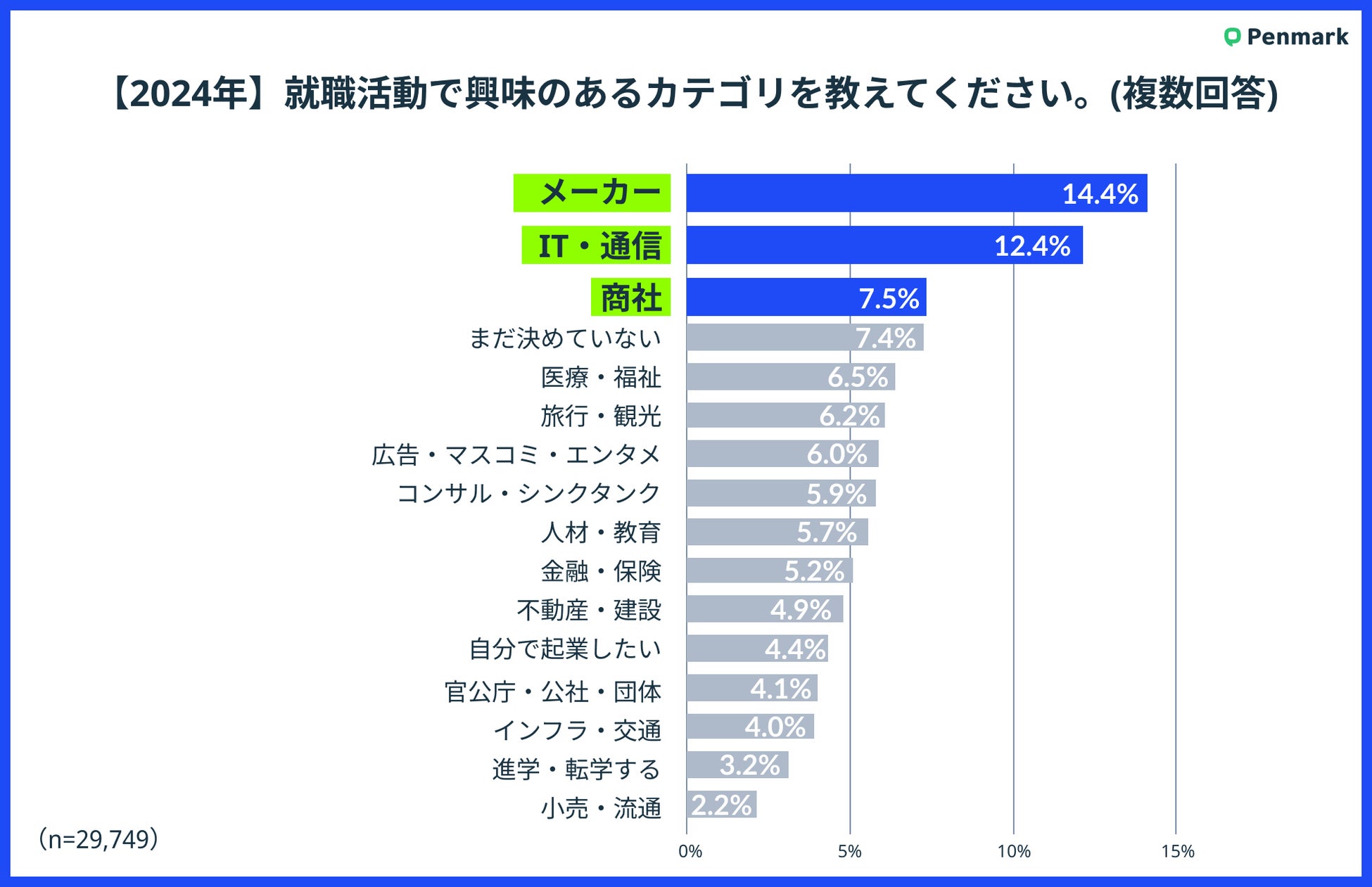 Z世代が就職活動で興味のある分野は、1位「メーカー(14.4%)」、2位「IT・通信(12.4%)」、3位「商社(7.5%)」となった。