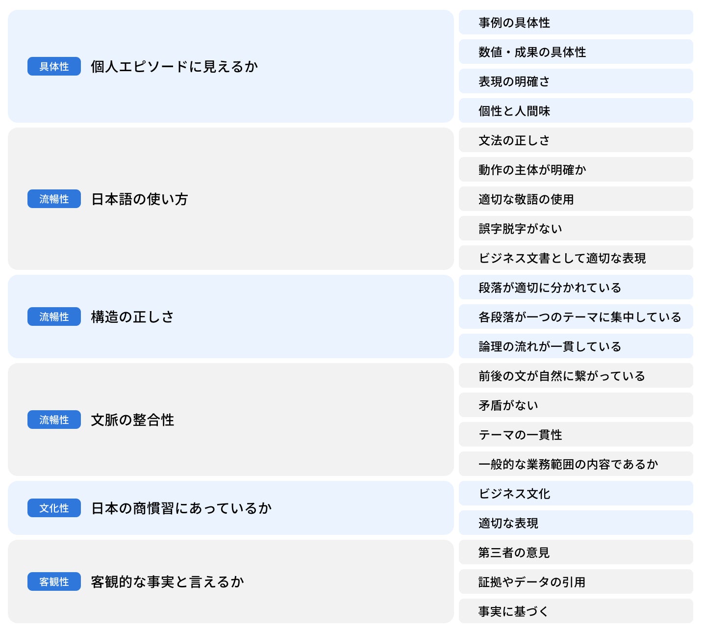 本取り組みにおいてはそのアプローチを抜本的に見直し、事前に生成AIによって大量の草案生成と評価を行ったものをデータベース化し、ユーザーの入力に基づき草案を引き当てるアプローチを採用しています。特に評価においては、評価AIの構築の際に複数の観点を組み込むこと(表1)で、より高品質な草案データの生成を実現しています。結果として、生成・評価された高品質な草案データ約115万件を事前に大規模データベース化し、ユーザーの入力を元に引き当てを行うことで、ユーザーがレスポンスを受け取るまでの時間を短縮し、ハルシネーションの発生や意図しない出力のリスク、処理が繰り返されることによる手間を軽減します。また全体の処理回数が減ることで、企業側のランニングコストも削減することができます。