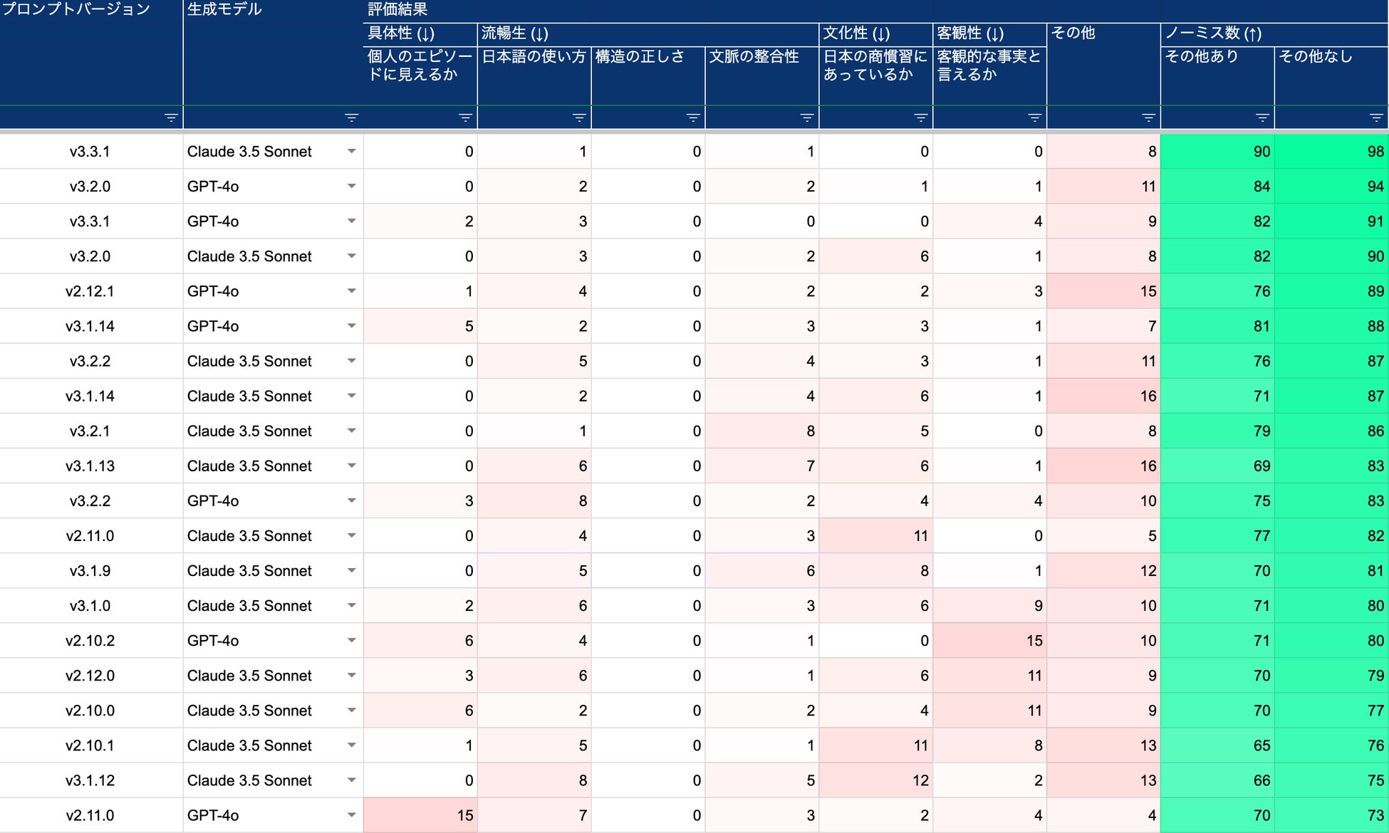 実際の評価AIによる評価結果サンプルは以下の表2になります。多様なプロンプトとモデルの組み合わせで生成された大量の自己PR草案をAIが評価し、高品質な草案のみを取り出すことに成功しています。百万以上の草案を作り、かつそれを評価することは人手では不可能なため、生成AIの活用により得られた成果と言えます。