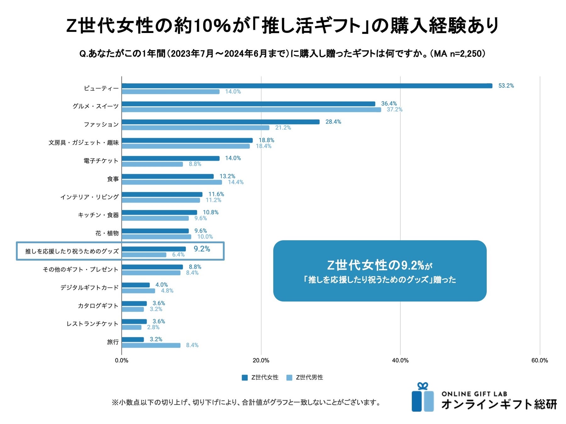 この1年間で贈ったギフトは「グルメ・スイーツ」が47.2%で1位になりました。2位の「ファッション」(24.1%)とは23.1%の差があり、「グルメ・スイーツ」が圧倒的に支持されているギフトであることがことがわかりました。ギフトの定番のカテゴリが並ぶ中、推しの誕生日ケーキや応援広告などの「推しを応援したり祝うためのグッズ(以下「推し活ギフト」)」が14位にランクインしました。特にZ世代(15歳から24歳)に限ると推し活ギフトは11位にランク入りしており、Z世代の女性は9.2%が推し活ギフトを購入したと回答しています。
