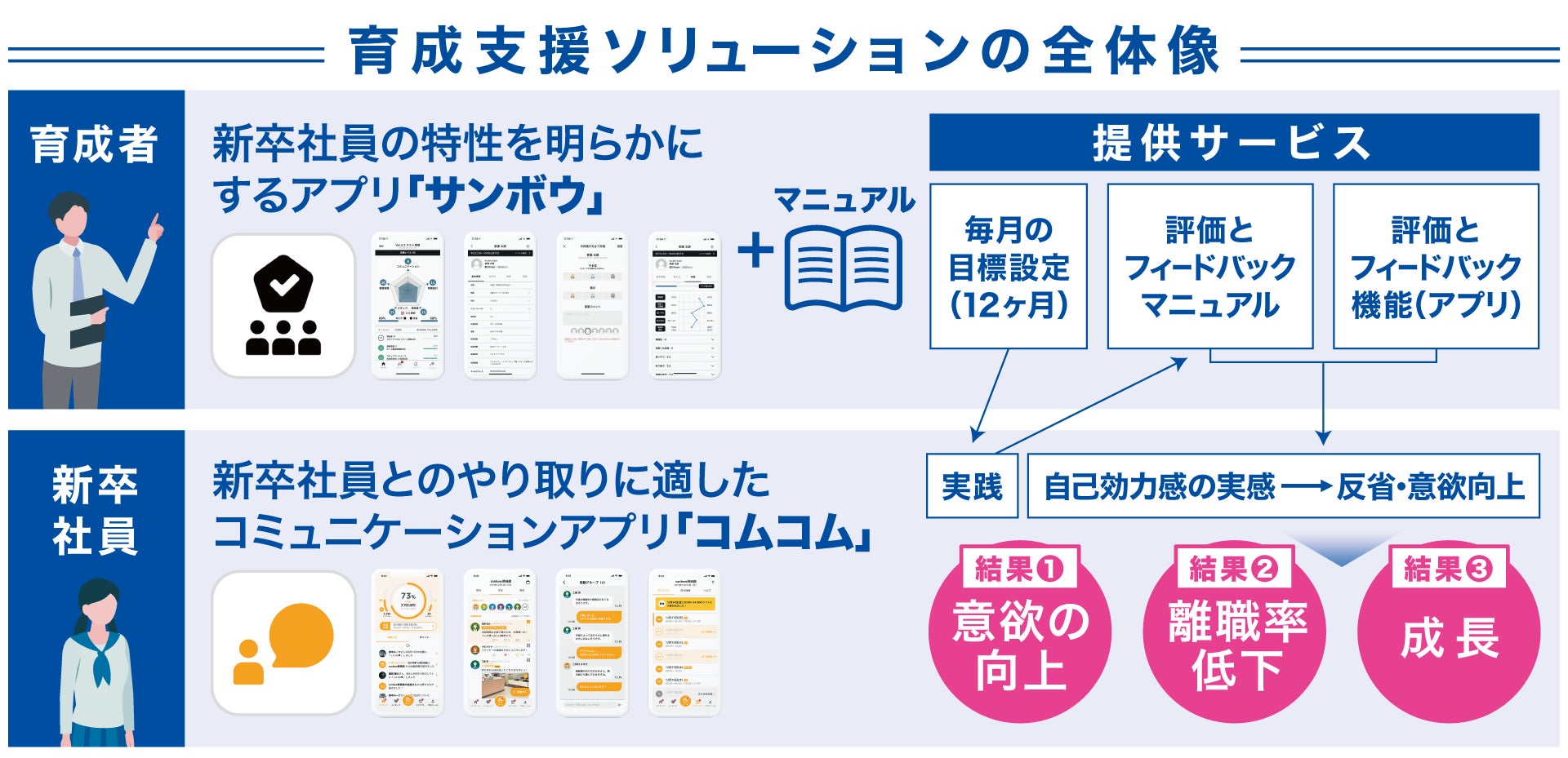 そこで、当社では新卒社員の特性を可視化するサーベイアプリ「サンボウ」と新卒社員とのやり取りに適したコミュニケーションアプリ「コムコム」を活用し、新卒社員との毎月の目標設定や評価とフィードバックのやり取りするためのマニュアル提供を始めます。就職後のリアリティショックの軽減や高卒社員のモチベーションアップを支援します。