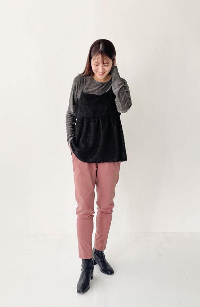 ニュアンスのあるピンクもトップスをブラックにすることで、甘くなりすぎず挑戦しやすいコーデです。