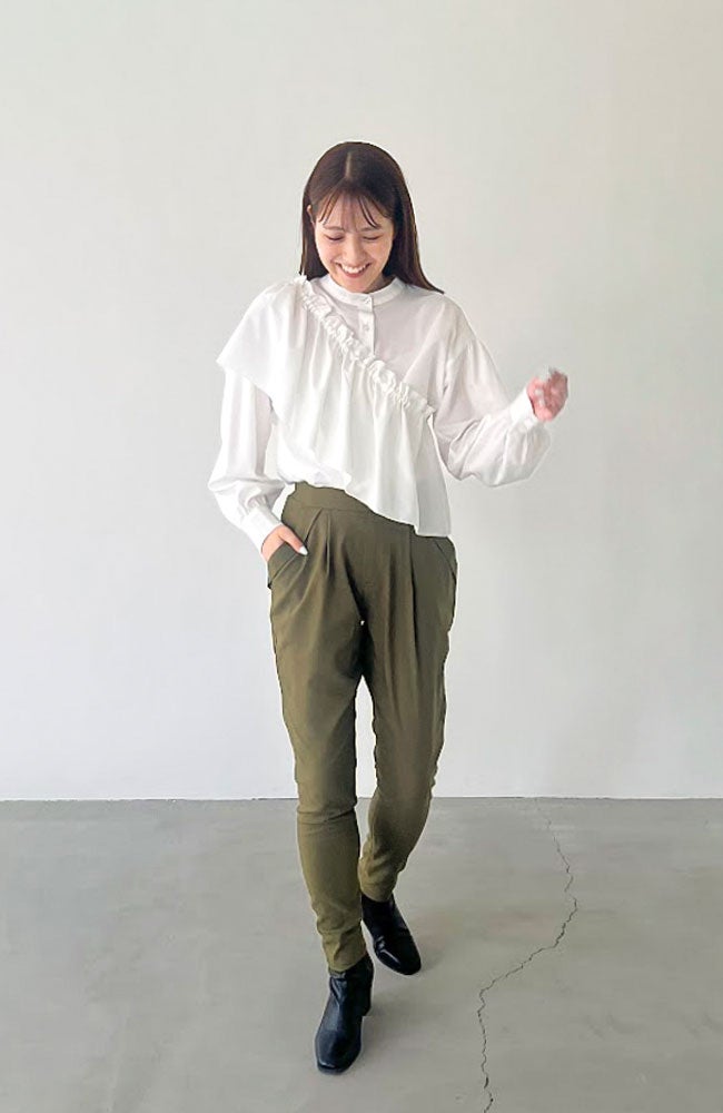 トレンドのフリル付きブラウスで、シンプルなコーデも周りと差が付くスタイルになります。