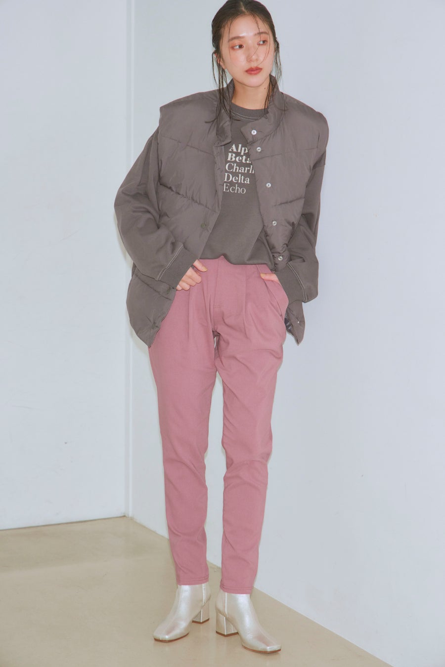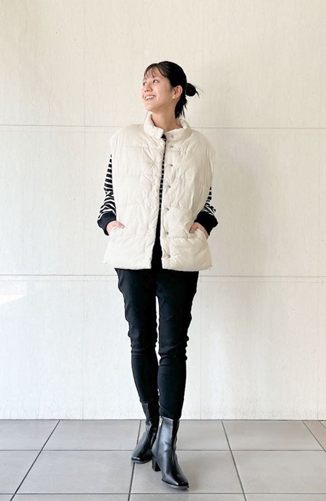 ボリューム感のある中綿ベストには、テーパードパンツとのシルエットがぴったり。