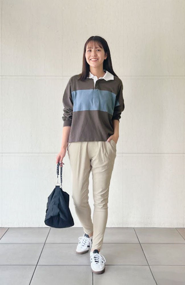ゆるっと着られるコンパクトな丈感のラガーシャツなので、ボトムスとのバランスも◎