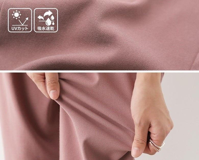 UVカット率95%以上で気になる日焼けも防止します。不快な汗や湿気を吸収し、洗濯しても乾きやすい吸水速乾機能付き。