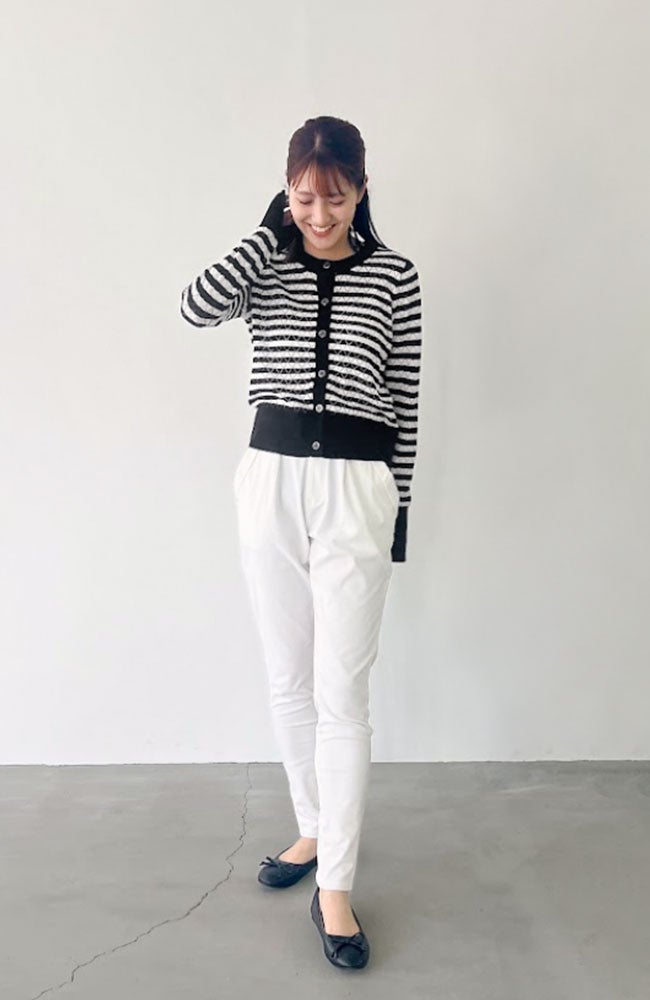 デザイン性のあるボーダーのカーディガンと合わせることで、すっきりとまとまります。