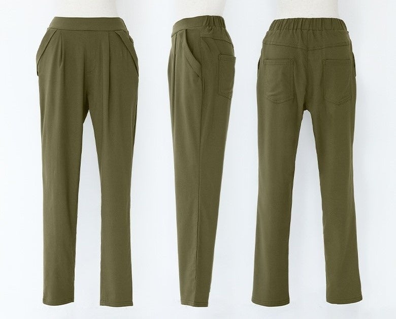ストレッチ性があり、ノンストレスな穿き心地。UVカット機能、吸水速乾機能を備え、テーパードシルエットで美脚を演出しつつ、体型カバーを叶える『美脚パンツ』です。