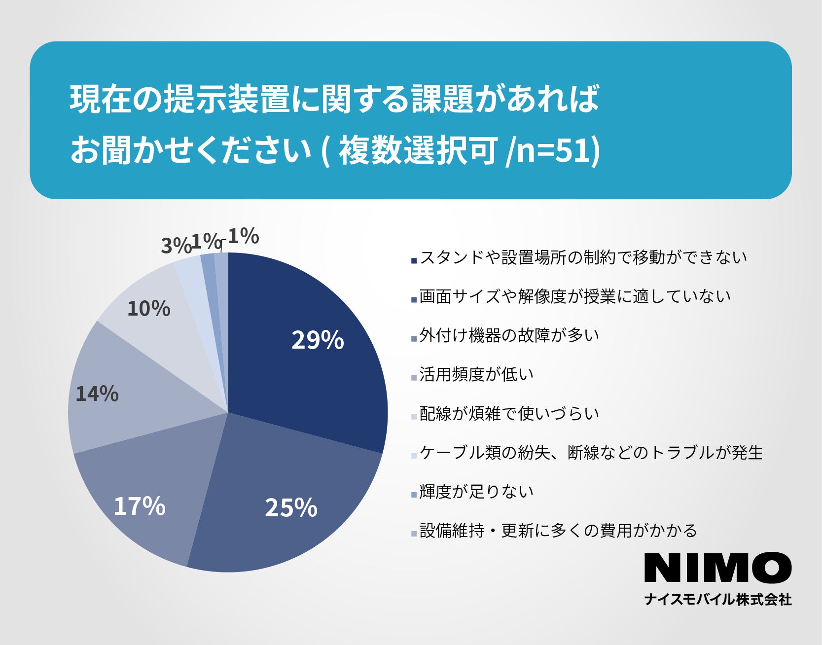現在使用している大型提示装置に関する課題について、複数選択式で調査を行ったところ、「スタンドや設置場所の制約で移動ができない」が最も多く、次いで「画面サイズや解像度が授業に適していない」、「外付け機器の故障が多い」といった回答が多い結果に。多くの教育現場で現場ニーズと合致しない機器が導入されており、何らかの使いづらさや運用上の課題を感じていることが明らかとなりました。