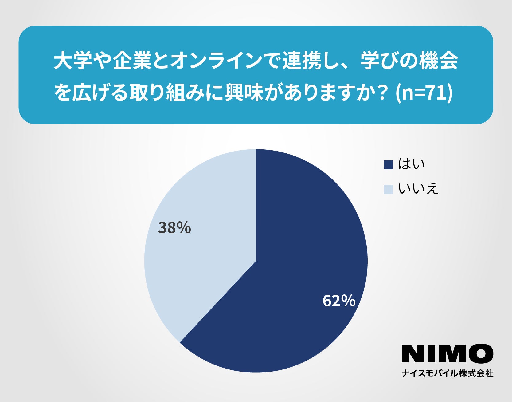 調査では、今後の教育活用に対する意識も明らかになりました。回答のあった71教育機関のうち約68%が「教育を活用した先進的な取り組みを行いたい」と回答、約62%が「大学や企業とオンラインで連携し、学びの機会を広げる取り組みに興味がある」と回答。これらの結果から、教育現場では活用が一定程度定着し、探究学習やSTEAM教育、産学連携といった次の教育展開を見据える段階に入りつつあると考えられます。