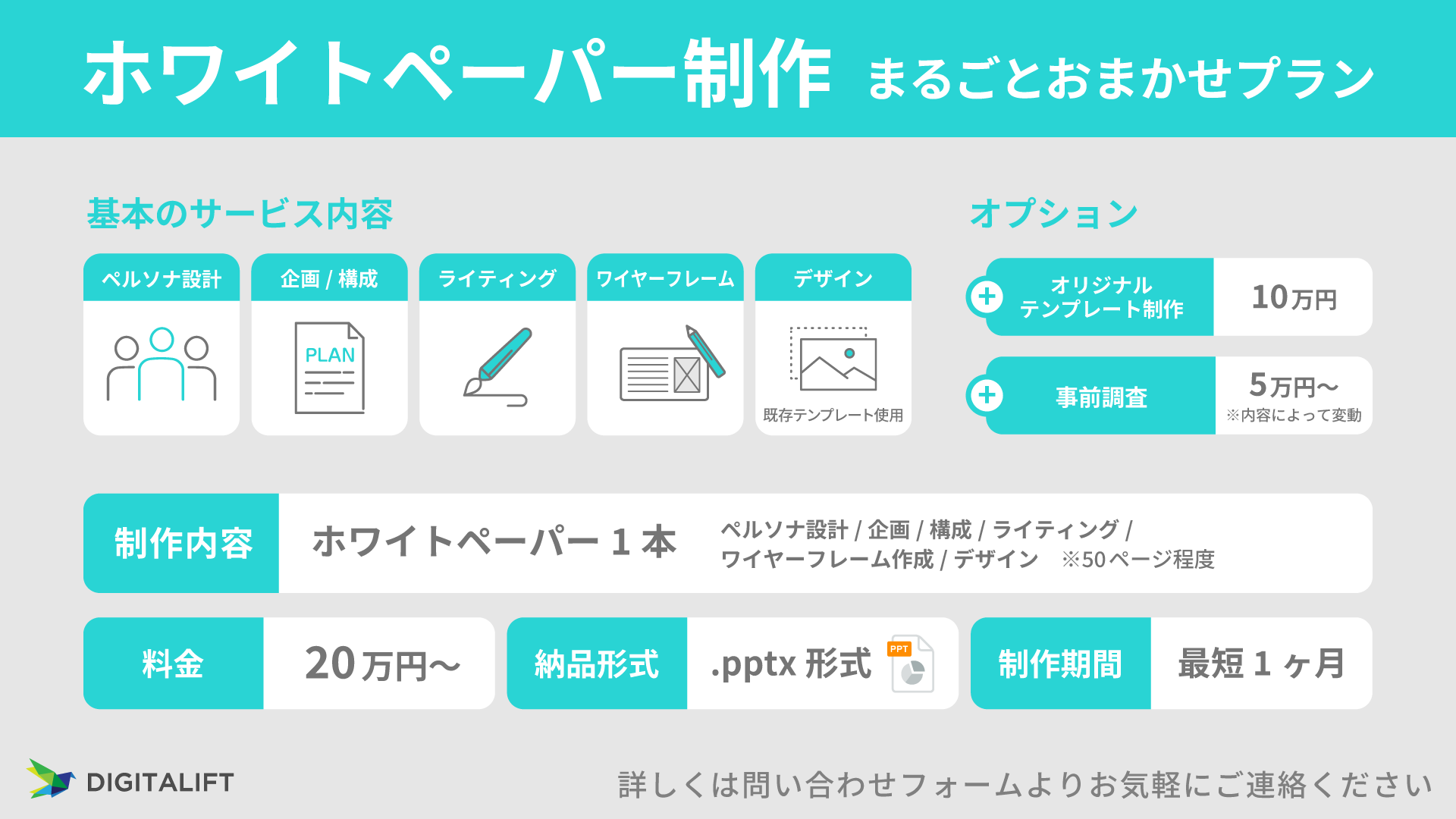 当社HPのお問合せフォームよりプラン名「ホワイトペーパーまるごとおまかせプラン」を明記の上ご連絡ください。