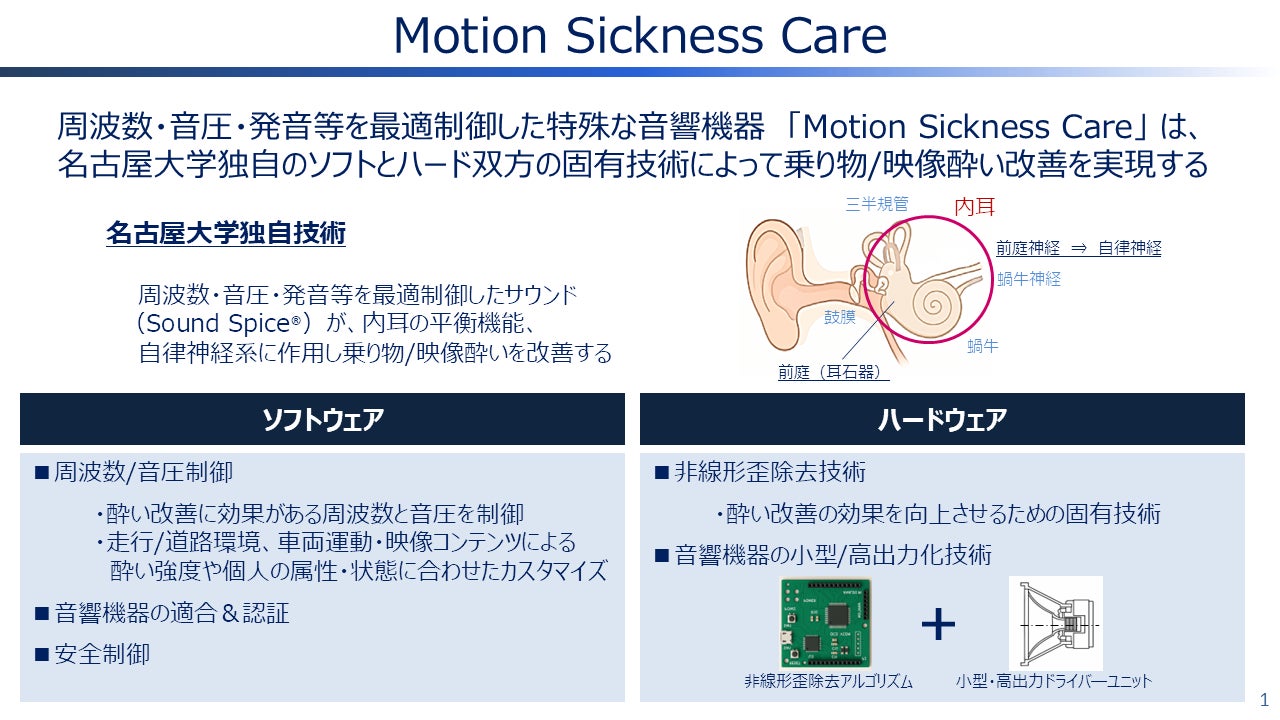 国立大学法人東海国立大学機構 名古屋大学(総長:杉山 直、以下、名古屋大学)未来社会創造機構 毛利雅弘 特任教授らの研究グループの研究テーマ「自動運転車における乗り物/映像酔いを改善する音響機器「Motion Sickness Care」の開発と事業化」が、科学技術振興機構(JST)「大学発新産業創出基金スタートアップ・エコシステム共創プログラム」採択プログラムのTokai Network for Global Leading Innovation (Tongali)「2025年度 GAPファンドプログラム『ステップ2』」に採択されました。株式会社みらい創造インベストメンツ(代表取締役社長:岡田 祐之)は本テーマについて事業化推進機関として伴走し、技術の事業化、スタートアップ創業を目指します。