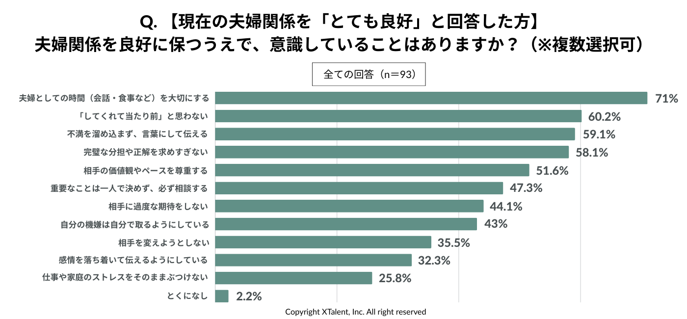 「関係をとても良好」と回答した人が、良好に保つために意識していることの1位は「夫婦としての時間を大切にする(71%)」。次いで、「してくれて当たり前と思わない(60.2%)」、「不満を溜め込まず、言葉にして伝える(59.1%) 」があげられました。