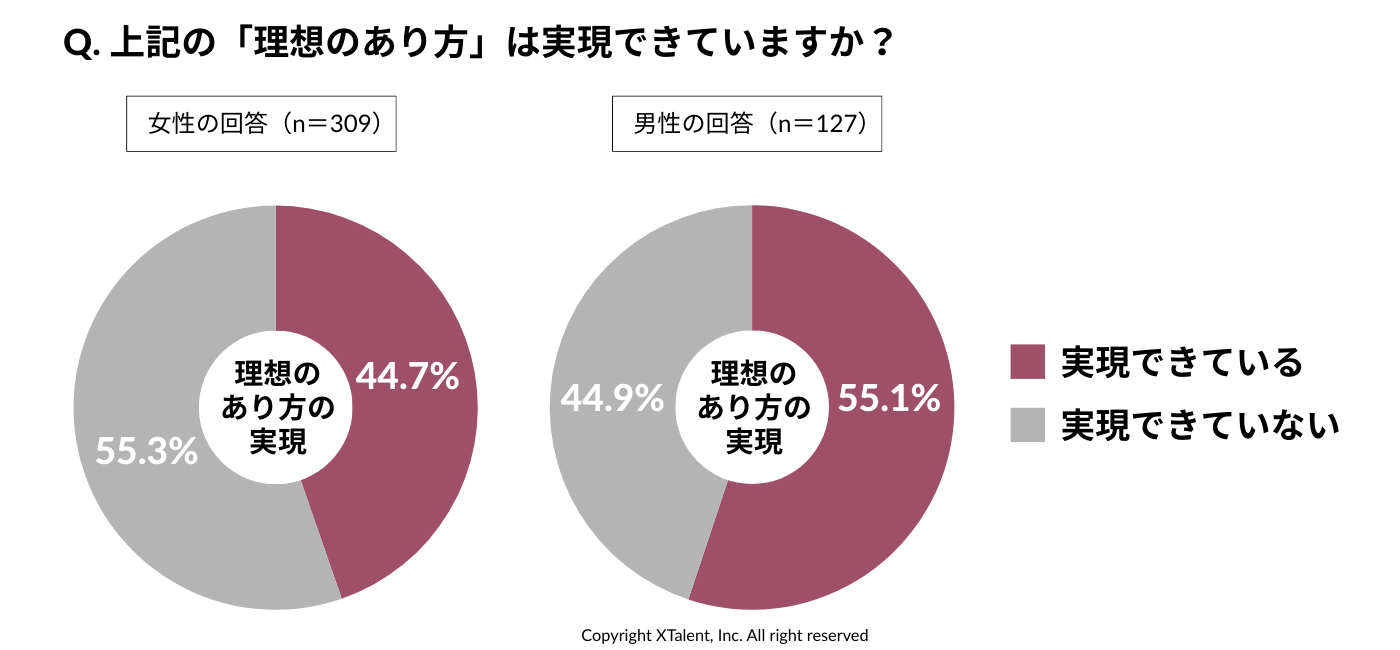 しかし、実現できているのは、男女ともに半数近くにとどまり、女性の方が「実現できていない」傾向にありました(女性:44.7%、男性:55.1%)。