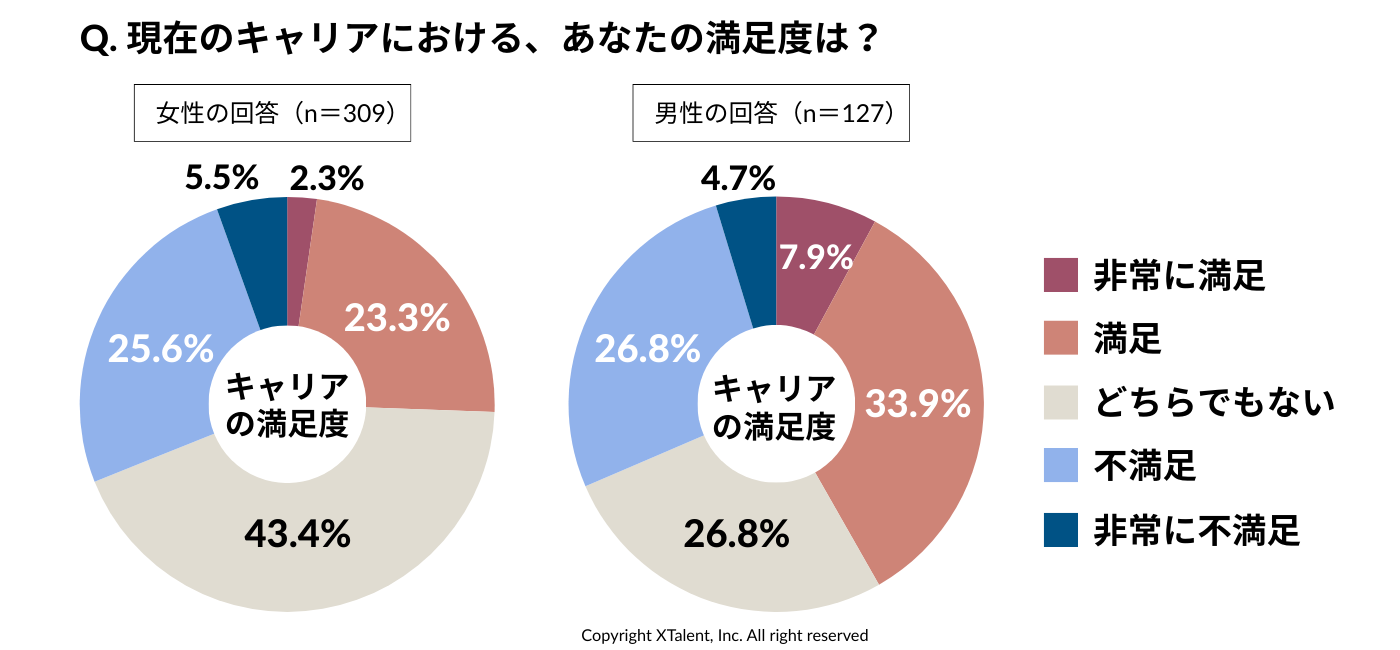 実際に、自身のキャリアに対して満足と回答した人は、男性が41.8%であったのに対し、女性は25.6%に留まりました。男女で16ポイント以上の開きがあり、女性の満足度が大幅に低い実態が浮き彫りになっています。