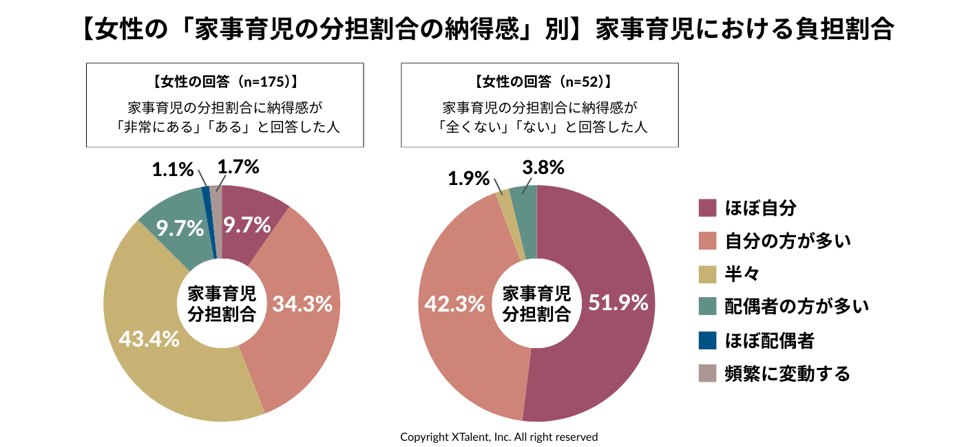 「家事育児の分担割合に納得感がある」と答えた女性の1位は「パートナーと半々」。一方で、負担が自分に偏っていても「納得感がある」と答えた層もいました。