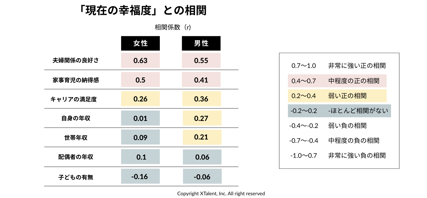 世帯年収よりも、夫婦関係の良好さ(相関係数:女性=0.63、男性=0.55)が幸福度に直結。
