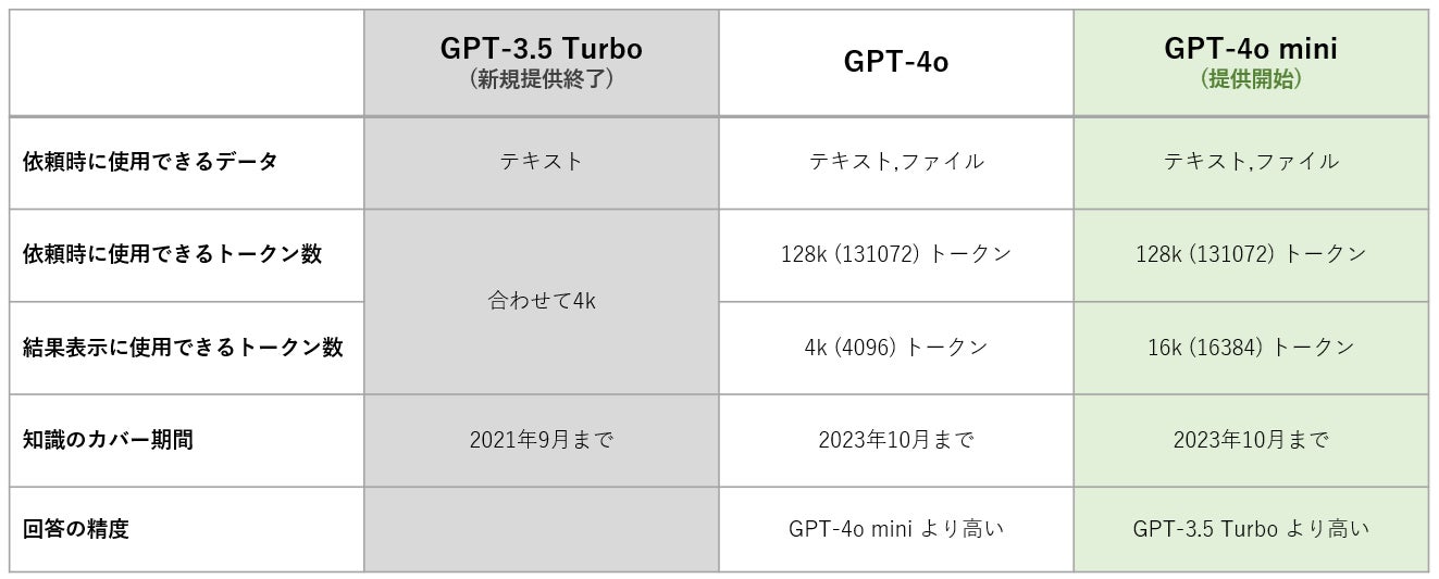 GPT-4o miniは、GPT-3.5 Turboより安価でありながら、回答精度が高いモデルとなっています。