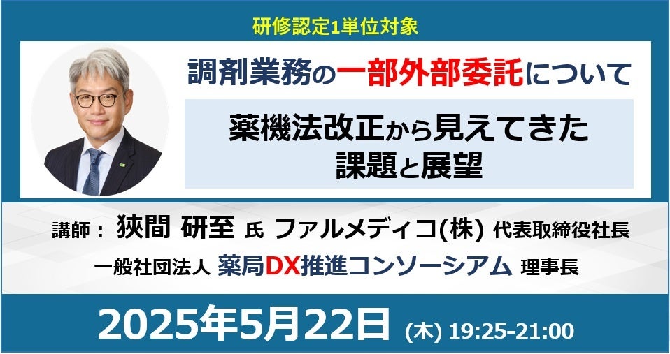 株式会社グッドサイクルシステム(本社:東京都港区、代表取締役社長 西村 真樹)は、薬局経営者・薬剤師向けにオンラインセミナーを開催します。今回は、狹間 研至 氏(ファルメディコ株式会社 代表取締役社長、一般社団法人 薬局DX推進コンソーシアム 理事長)をお招きして「調剤業務の一部外部委託について 薬機法改正から見えてきた課題と展望」についてご講演いただきます。