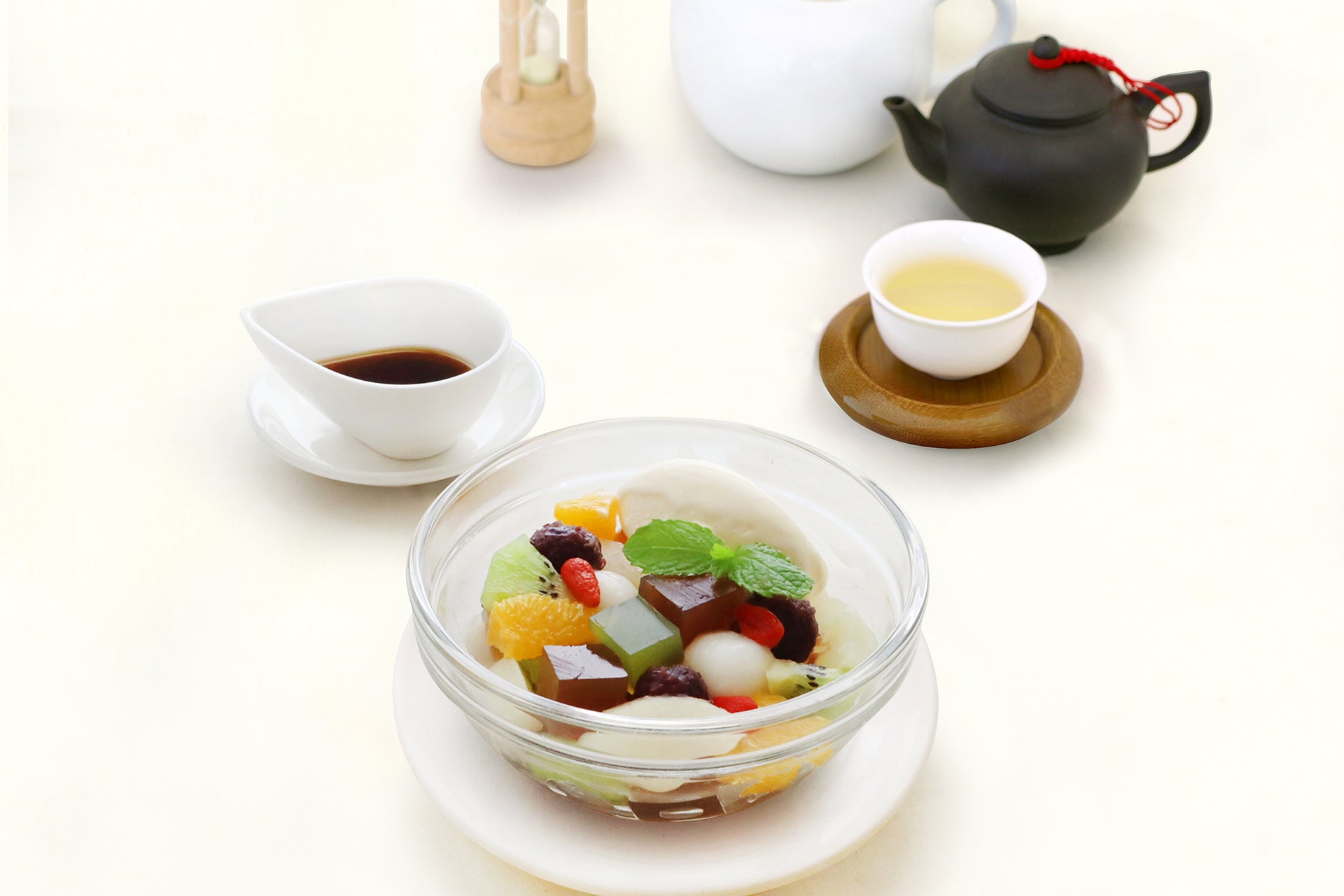 すっきり爽やかなマテ・グリーンと香ばしくローストされたマテ・ブラックの寒天に、秋を感じる梨など4種のフルーツと白玉を合わせ、香ばしいマテ・ブラックの蜜を添えたオーガニックマテ茶のあんみつ風スイーツです。