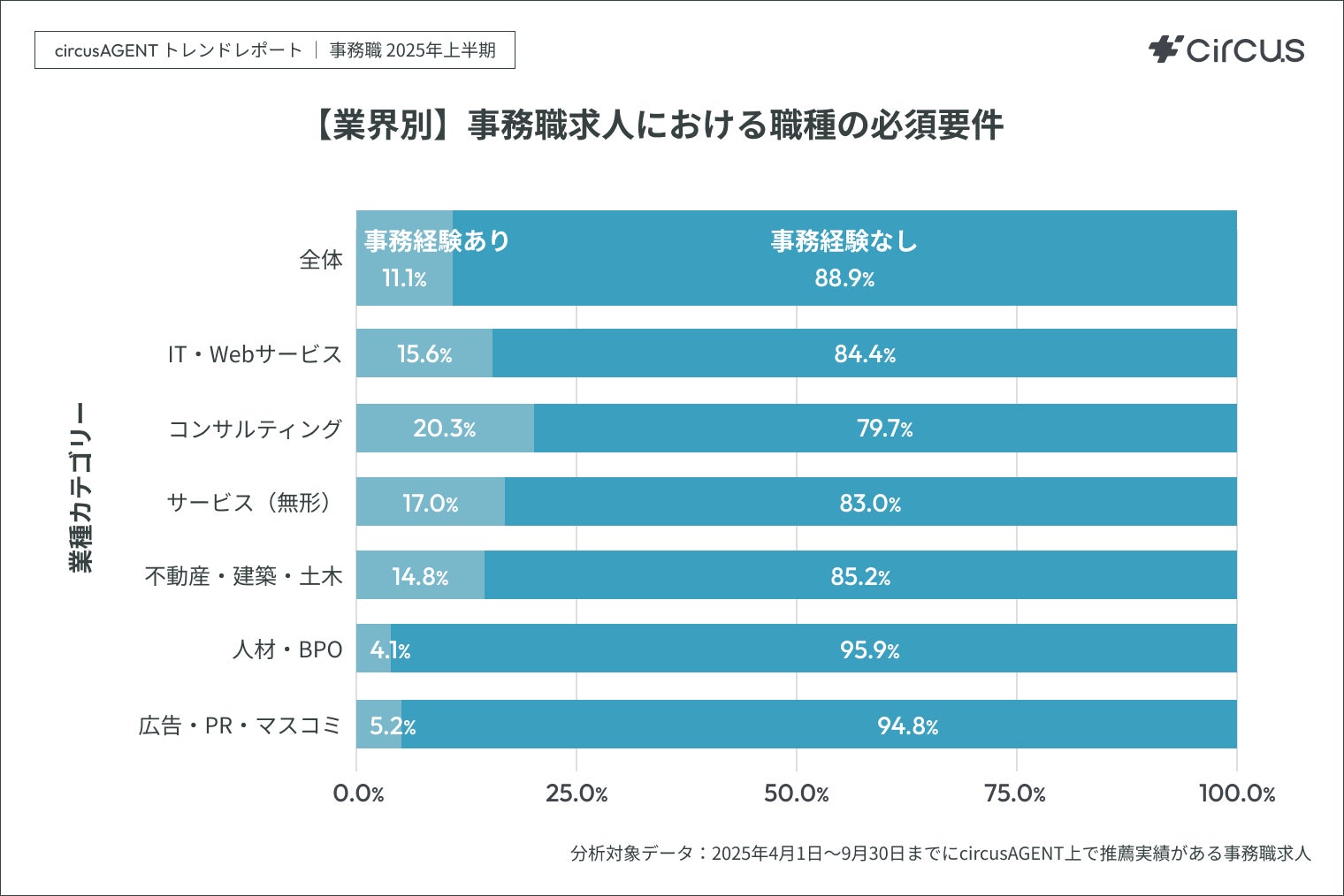 circus株式会社(所在地:東京都中央区、代表取締役:⽮部 貴志)は、⼈材紹介プラットフォーム「circusAGENT」に掲載された求⼈データ(2025年4⽉〜9⽉)をもとに、事務職のエージェント採⽤トレンド調査を行いました。