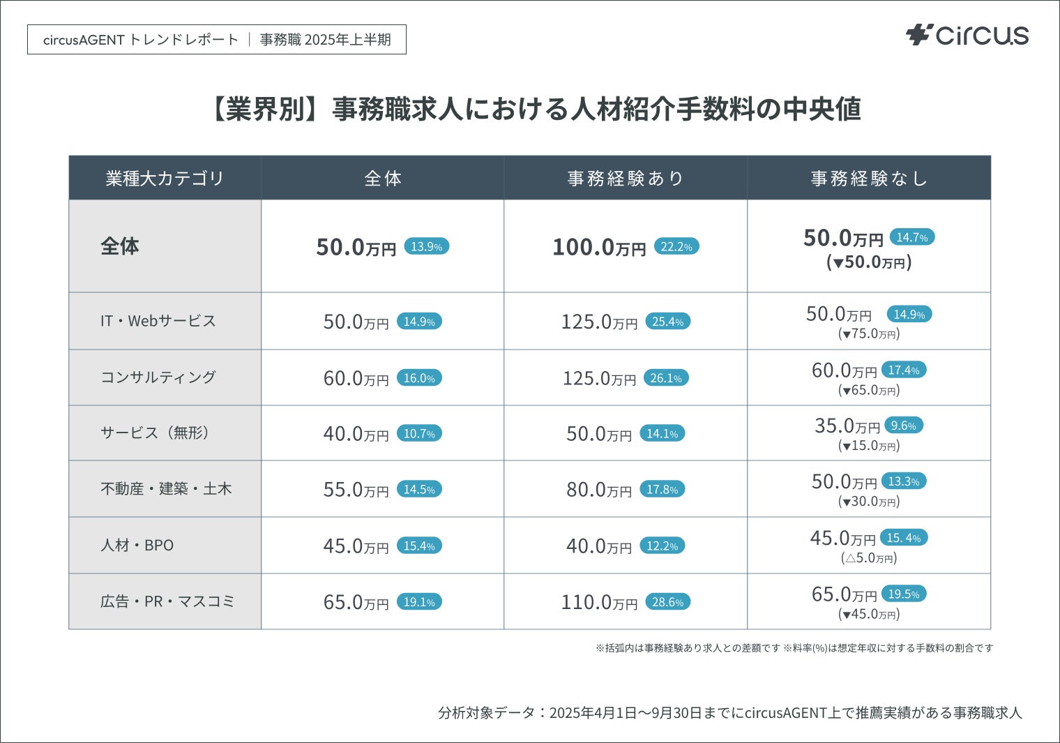 紹介手数料中央値・料率:経験有無による料率差は7.5%に留まる。コスト構造が事務職の「買い手市場」傾向を示唆